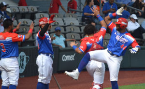 El pelotero Anthony García celebra con sus compañeros al conectar cuadrangular. / Inter News Service-foto por Héctor Rosa.