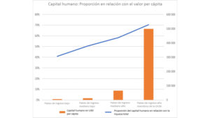 “El capital humano representa dos tercios -la mayor parte- de la riqueza mundial. En el informe se indica que el capital humano representa alrededor del 70% de la riqueza en los países de ingreso alto y solo el 40% en los países de ingreso bajo. El capital humano se mide como el valor actual de los ingresos de una persona en lo que le resta de vida laboral, teniendo en cuenta la educación y las habilidades, así como la experiencia y la probabilidad de participar en la fuerza de trabajo en distintas edades. En el documento se presentan sólidos argumentos económicos para invertir en capital humano y así aumentar la riqueza y el crecimiento económico futuro.