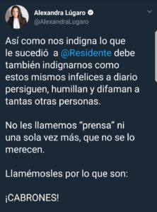“Así como nos indigna lo que le sucedió a @Residente debe también indignarnos como estos mismos infelices a diario persiguen, humillan y difaman a tantas otras personas. No les llamemos “prensa” ni una sola vez más, que no se lo merecen, Llamémosles por lo que son: ¡CABRONES!”, escribió la política. El tuit se convirtió inmediatamente en objeto de “memes” en los que se repetía la palabra ofensiva.