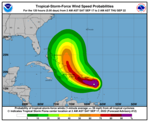 Meteorología pronostica que Fiona pasaría muy cerca por el sur de Puerto Rico durante la noche de este sábado y en la madrugada del domingo con vientos ente 65 y 70 millas por hora, al tiempo que se estima que podrían caer de 4 a 14 pulgadas de lluvia.