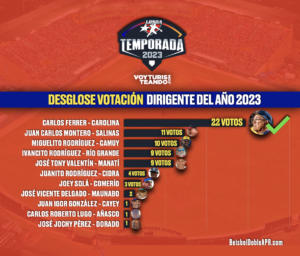 Carolina, 10 jun (INS).- El mentor de Gigantes de Carolina, Carlos Ferrer, fue escogido Dirigente del Año de la temporada 2023 del Béisbol Superior Doble A con el apoyo de los periodistas y comentaristas deportivos que participaron en la votación, coordinada por la Federación de Béisbol de Puerto Rico (FBPR).