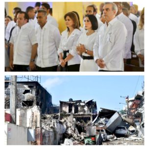 El presidente Luis Abinader en la misa en honor a los fallecidos y, abajo, una vista de parte de la destrucción causada por el estallido. Inter News Service