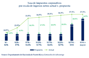 En cuanto a las corporaciones, el gobernador Pierluisi sostuvo que se reitera en la propuesta de tres tasas, reduciendo la tasa máxima, que ahora llega a 37.5 por ciento, a un 33 por ciento, con un sistema más sencillo y progresivo.